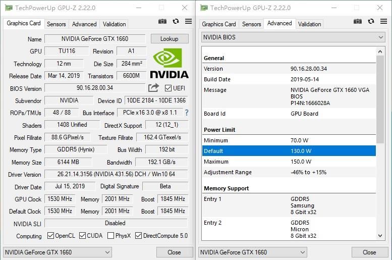 通過上面的GPU-Z截圖可知,GTX 1660 Ti冰龍超級版擁有1536個流處理器,基礎頻率1500MHz,Boost頻率1830MHz,較公版要高出60MHz。192Bit 6GB GDDR6顯存,顯存帶寬288GB/s,TDP為130W,比公版高出10W,而且還能繼續拉到150W。