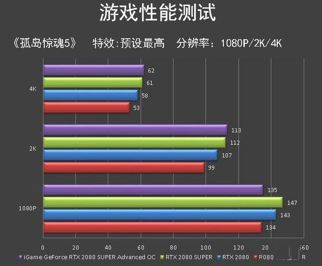 實際游戲測試中,iGame GeForce RTX 2080 SUPER Advanced OC的幀數表現不錯,比公版RTX 2080 SUPER有一到兩幀的提升。而與RTX 2080相比,幀數領先大約在6%~8%左右,基本符合理論測試中的性能差距。