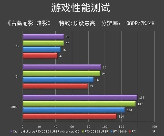 理論性能上,這款顯卡的表現不錯,那么在實際使用中表現如何呢?本次測試中,我們使用《刺客信條 奧德賽》、《古墓麗影 暗影》和《孤島驚魂5》這三款大作進行測試。畫質設置為預設最高,分別測試在1080P/2K/4K三種分辨率模式下,這款顯卡的性能表現。并與RTX 2070 SUPER、RTX 2080、RTX 2080 SUPER三款顯卡進行對比。