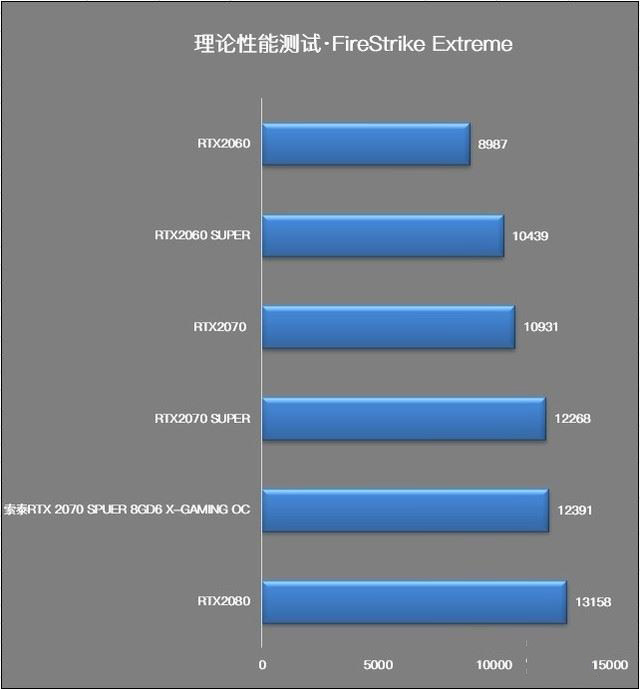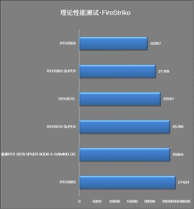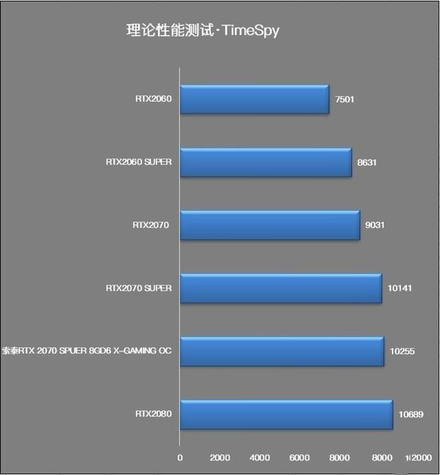 性能測試階段,將由理論性能、游戲性能、功耗測試以及溫度測試等測試組成,其中理論性能依舊采用業界公認的3D MARK進行測試,同時和公版不同性能的顯卡進行比對,一探索泰RTX2070super-8GD6 X-GAMING OC的具體性能。
