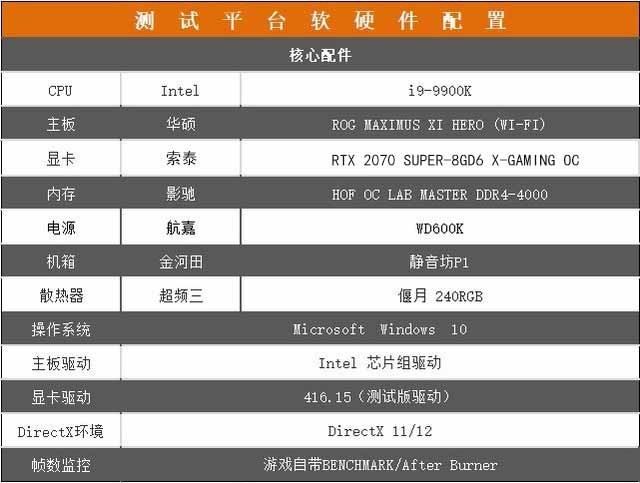 在聊完外觀和用料,下面進入實測環節,先來看看此次首測的測試平臺,CPU方面我們采用第九代Intel八核心十六線程的i9-9900K、ROG MAXIMUS XI HERO (WI-FI) 主板、影馳的HOF OC LAB MASTER DDR4-4000內存,電源為航嘉WD600K、機箱為金河田靜音坊P1、散熱器采用的是超頻三偃月240 RGB。