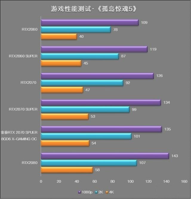 接下來,我們通過《孤島驚魂5》、《古墓麗影暗影》、《刺客信條奧德賽》三款3A大作,在4K/2K/1080P三種不同分辨率、全特效情況下,進行顯卡游戲性能的測試,探尋索泰RTX2070super-8GD6 X-GAMING OC實際游戲性能表現。