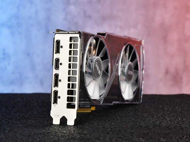 其中,最為亮眼的便是采用亞克力水晶面板設計的顯卡外殼了。區別于傳統顯卡“黑、硬、重”等刻板印象,水晶外殼透明的配色搭配著兩個磨砂材質的透明散熱風扇,使得整個顯卡有種輕盈和純凈的質感,打破了筆者對于顯卡的傳統認知。