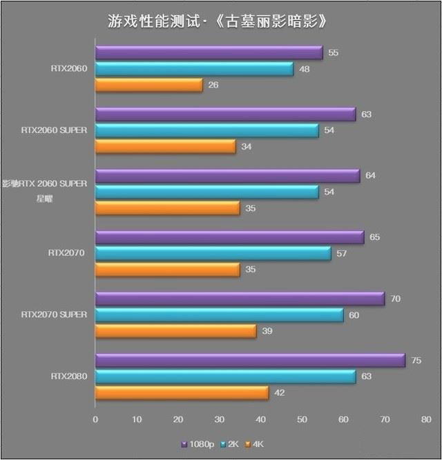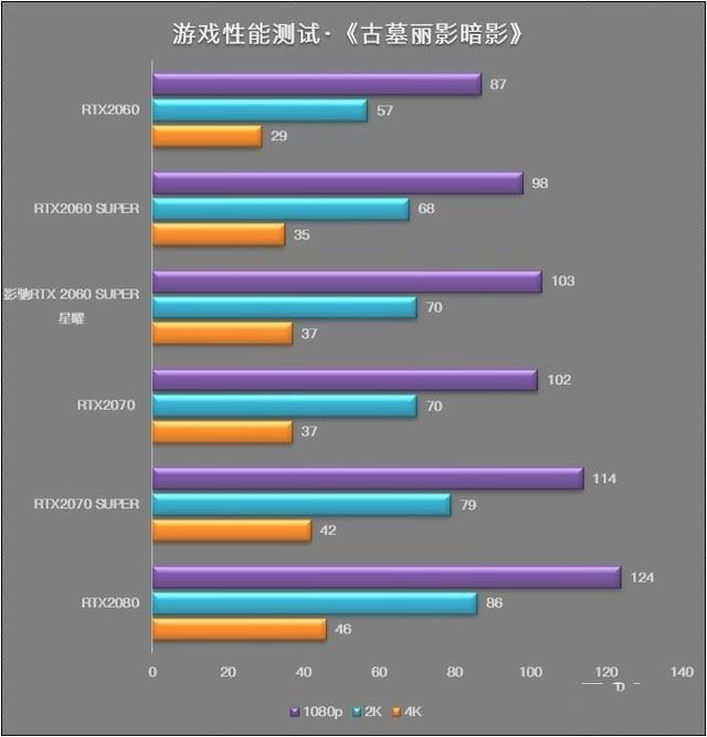 在游戲性能測試中,基于影馳對于SUPER系列的調試和散熱設計,使得實際性能表現再次超越公版RTX 2060 SUPER,甚至在《古墓麗影暗影》的游戲測試中,影馳RTX 2060 SUPER星曜的游戲性能竟超過了RTX 2070,可見此次影馳RTX 2060 SUPER星曜性能的不俗。