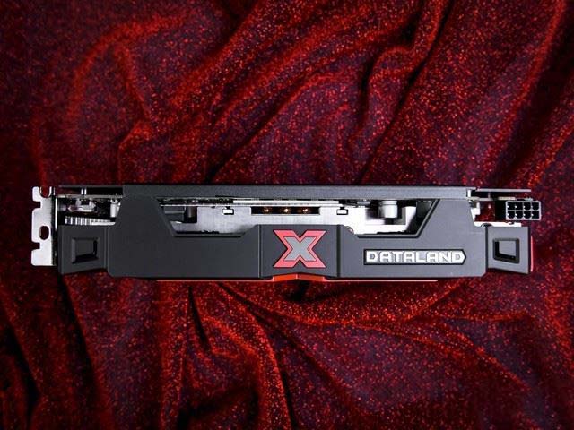 顯卡頂部也非常簡單,一個“X”型標志+DATALAND名稱,非常簡潔,從中間還能看到隱約漏出的散熱銅管。另外顯卡配置了一個8pin的額外供電。