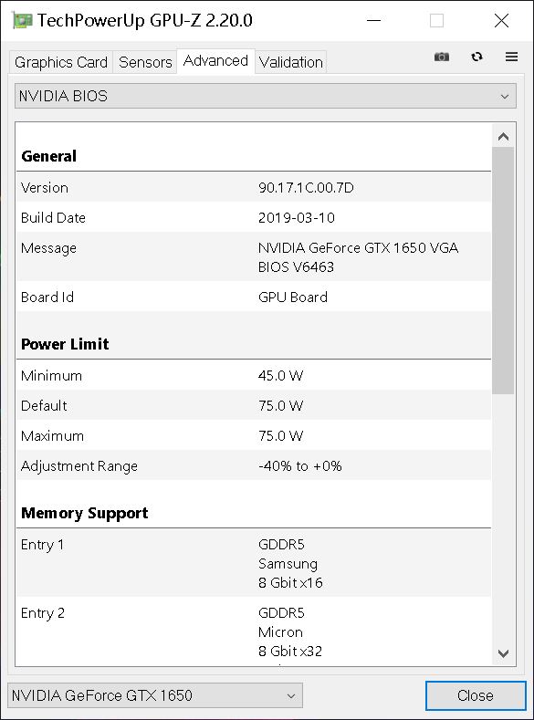 這里可以看到耕升GTX 1650炫光OC默認(rèn)功耗上限為75W,由于沒有外接供電接口,顯卡能獲得的最大供電功率就是PCIE接口提供的75W,所以也不可能向上解鎖更高的功耗上限了。