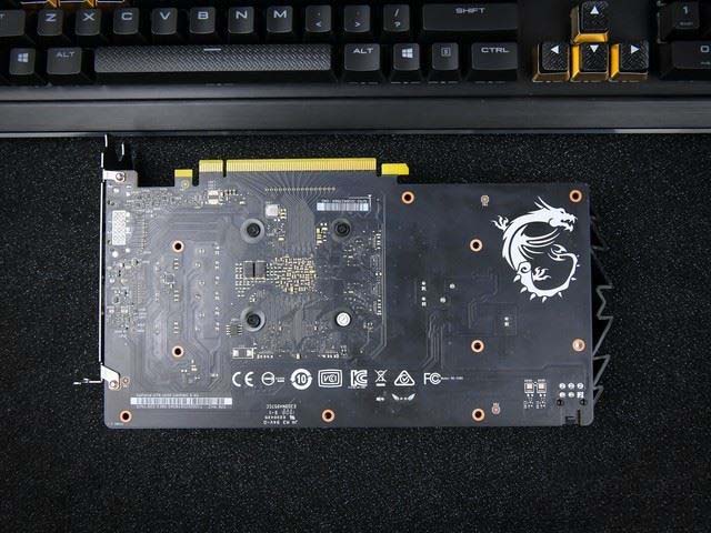 由于入門級定位的問題,顯卡并沒有背板,不過微星細心地將龍盾印在了顯卡的右側。而且大家可以發現散熱模組并沒有漏出PCB太多,這點給好評。