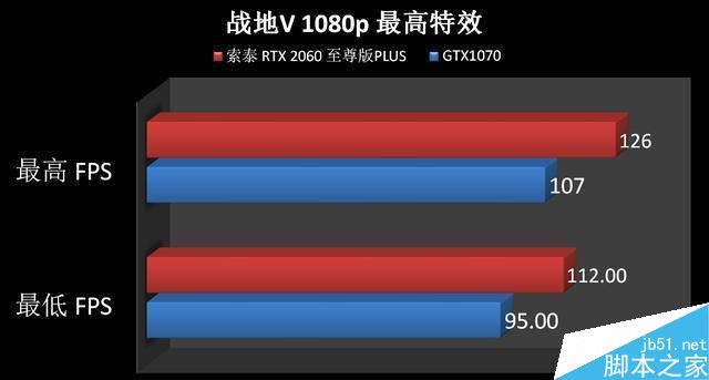 ▲測試匯總表格在這里哦,右邊欄是索泰RTX2060至尊版PLUS,左邊欄是GTX1070,其中GTX1070在戰(zhàn)地5開啟光追的話,會卡到懷疑人生,而且不能開啟DLSS,那么其他的對比的話 我們來看看柱形圖這個直觀的表現(xiàn)吧。