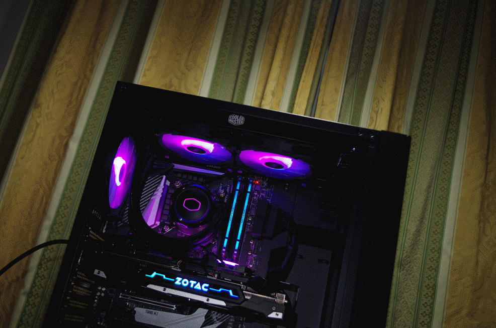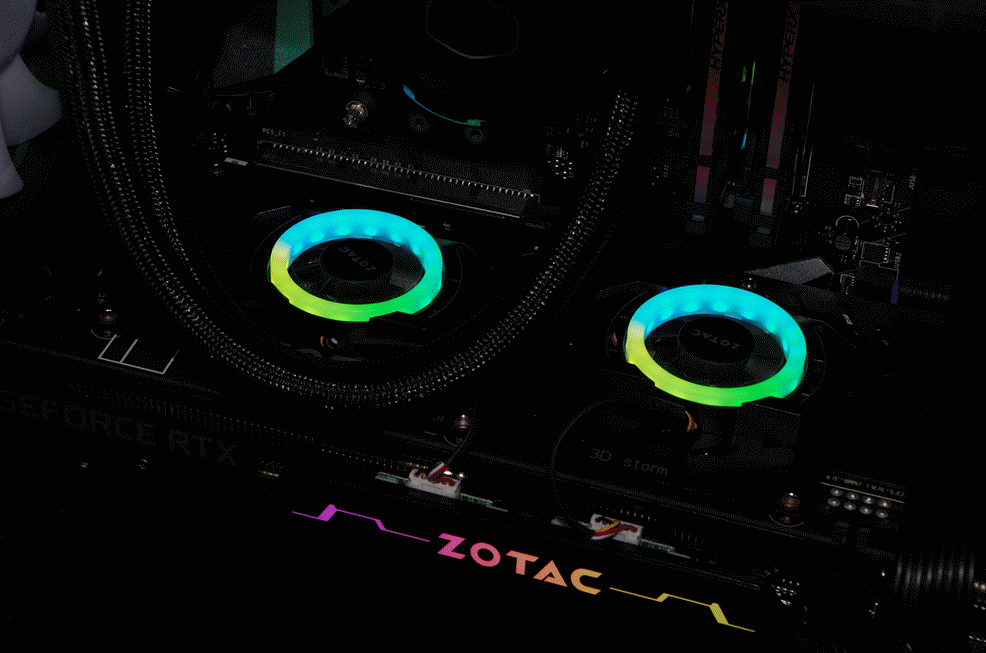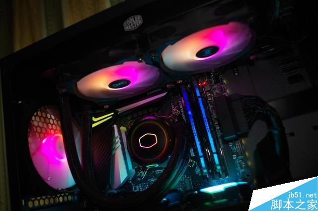 ▲水冷頭、內(nèi)存條、RGB風(fēng)扇、顯卡背部的RGB風(fēng)扇的燈光秀,看上去挺不錯的,不想RGB的時候可以關(guān)掉。