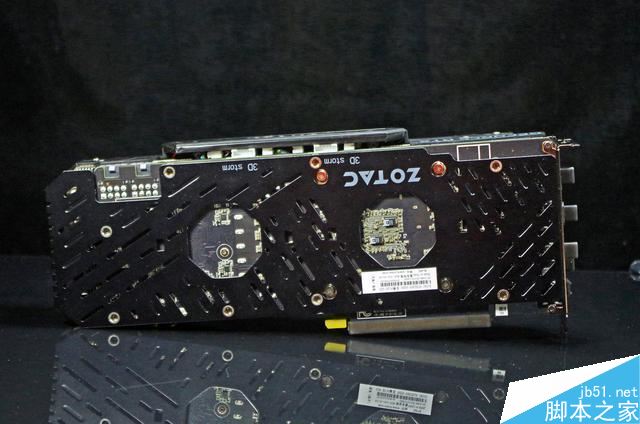 ▲背面的一體式背板,可以為整張顯卡提供更強(qiáng)的機(jī)械強(qiáng)度,同時也能輔助散熱,背后有兩個大孔,就是用來組裝2個輔助風(fēng)扇的。