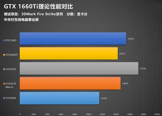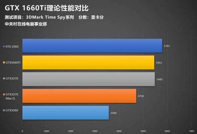 為了更為直觀的了解GTX 1660Ti理論性能水平,我選取了RTX 2060、GTX 1070、GTX 1070 Max-Q和GTX 1060五款顯卡(均為游戲本中的顯卡)進(jìn)行對(duì)比,主要對(duì)比代表DX12的Time Spy和代表DX11的Fire Strike。