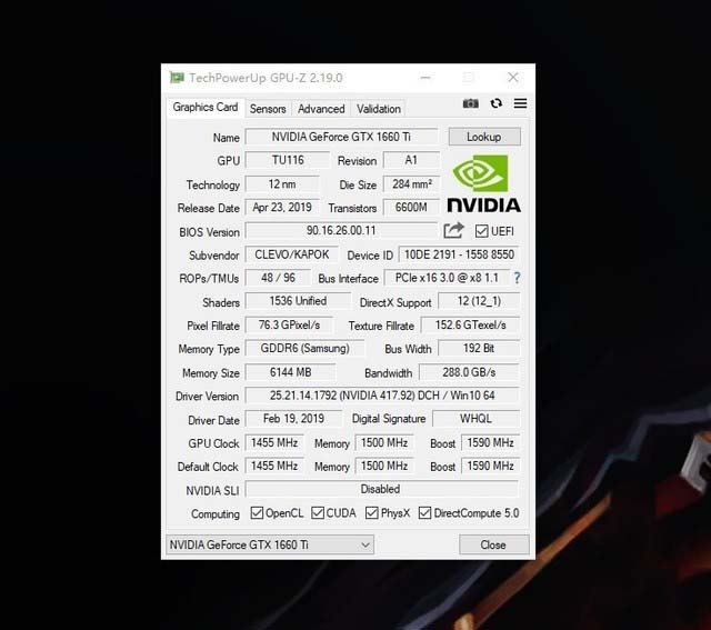 參與測試的機(jī)型為神舟Z7-CT7NA,其硬件規(guī)格為:i7-9750H、16GB DDR4、512GB SSD、GTX 1660Ti 6GB。顯卡驅(qū)動(dòng)型號(hào)為417.92(英偉達(dá)官網(wǎng)430.39版本驅(qū)動(dòng)無法安裝,使用GeForce Experience檢查驅(qū)動(dòng)更新,提示已為最新驅(qū)動(dòng))。