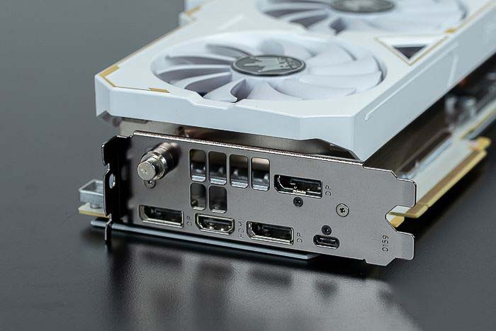 在顯卡背板處提供有豐富的視頻輸出端口,分別為DisplayPort×3、HDMI×1、USB-C×1。同時還有一個按鈕,這個是影馳的“HyperBoost”功能開關,可以調整風扇轉速。從這角度也能看到這款顯卡是2.5槽的厚度,所以在安裝時還是要注意留有空間。在背板上也有幾個螺絲,在接下來的拆解中,需要注意要將這幾個螺絲擰下,否則中框是拆不下來的。