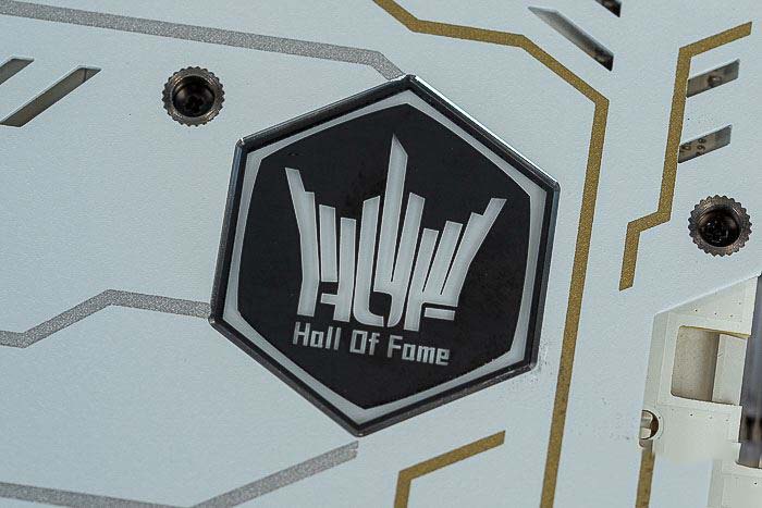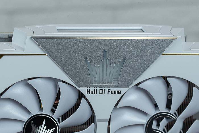 顯卡背面有背板覆蓋,材質是鋁合金,這塊名為“HOF ArmorX”的背板在外觀上整體涂裝也是白色,有金色線條點綴,在顯卡末端有一個HOF信仰logo,六邊形輪廓對應著影馳HOF的六邊形理論,可以發光。這個厚度1毫米的背板不只是個裝飾品,它能為這么大的顯卡提供保護的同時,其足夠的強度也能在一定程度上防止PCB板變彎。