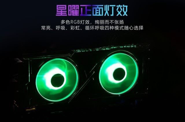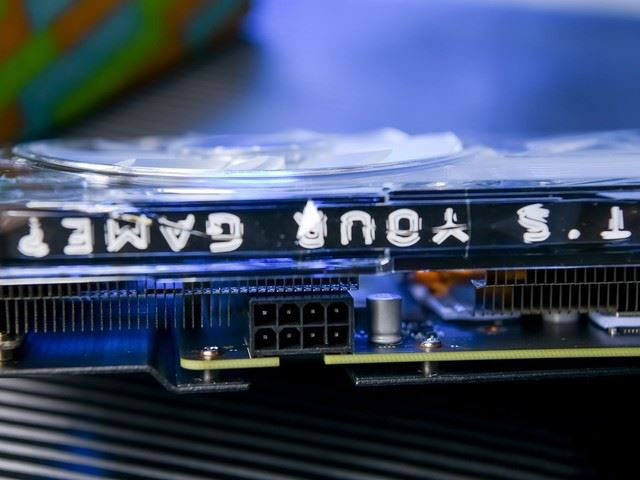 第二就是燈光了,影馳RTX 2070 星耀的發(fā)光點(diǎn)在風(fēng)扇下方,配合透明風(fēng)扇就能夠獲得相當(dāng)好的燈光效果,然而,如果加上亞克力的外殼,燈光就會(huì)隨著透明板在顯卡上暈染開來,特別是顯卡上方“WHAT'S YOUR GAMER”的logo和裝飾紋路也會(huì)有燈光效果,不得不說影馳在選材方面是很取巧的。