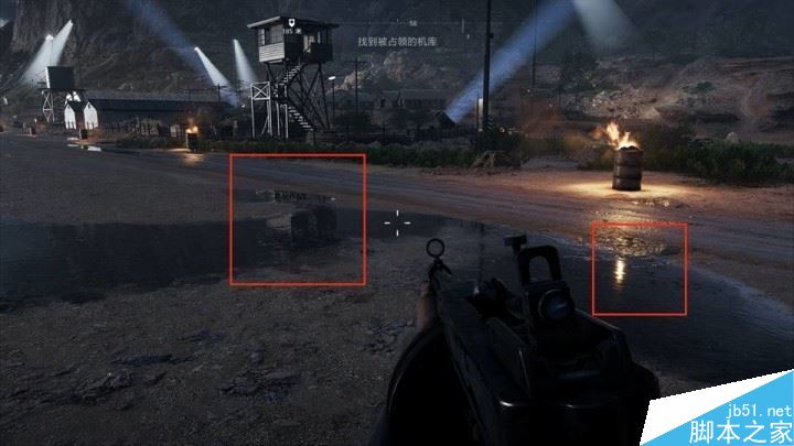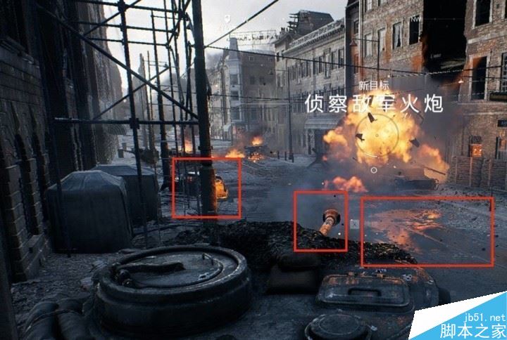 坦克在開炮爆炸的瞬間有三處反射點,左邊廢舊汽車的背面、中間的坦克炮管、右側地面上的積水都能映襯出爆炸瞬間的火光。