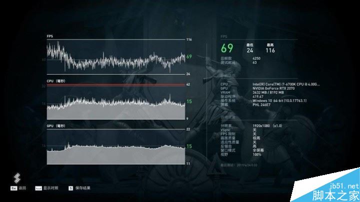 性能測試最高幀數116,最低幀數24,平均幀數69。