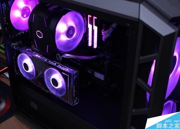 顯卡使用在我前兩年裝配的機器上搭配華碩的神光同步使用效果還是不錯的,因為使用的是酷冷H500P機箱所以顯卡可以實現傳統的水平安裝和垂直安裝兩種方式,通過兩種不同的安裝方式來看一下顯卡燈效到底如何。值得注意的是顯卡并不具備燈光同步功能,可以把燈光統一設置成一種顏色來使用。