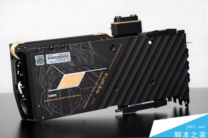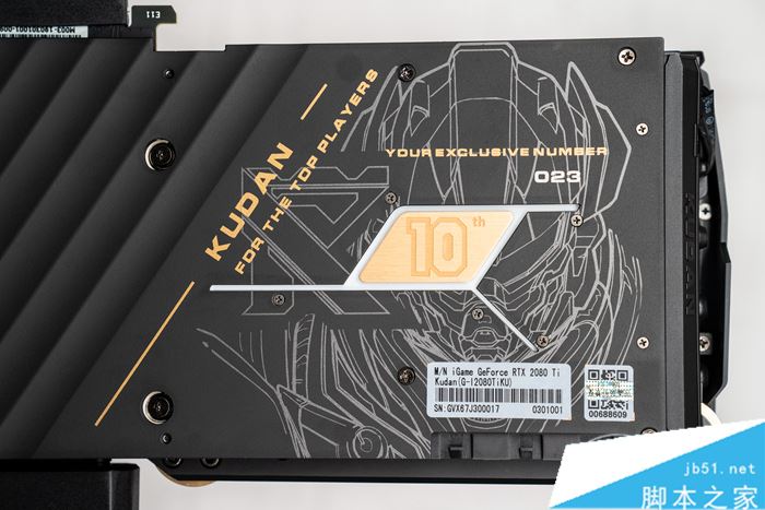 背板上印有伏爾塔納人物造型頭像,以及10周年銘牌,以及獨一無二的RTX 2080 Ti Kudan顯卡序列號,我們拿到的是023號。