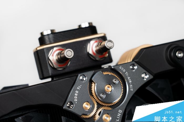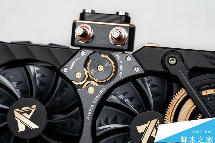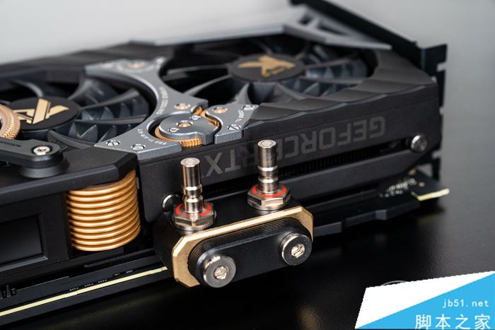 從上一代GTX 1080 Ti Kudan顯卡就采用了風水冷混合散熱方案,而且還能讓玩家自由選擇風冷或者風水冷并用,秘密在于GPU散熱器集成了一個快拆式止水閥,可以自由接入對應的冷排。