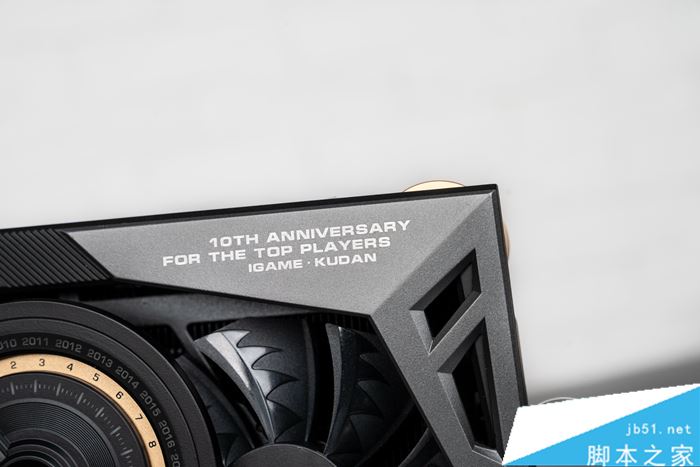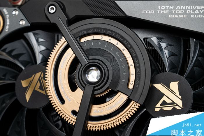 RTX 2080 Ti Kudan顯卡整個導風罩都是使用金屬打造,而“陀飛輪”的ID設計一共使用了兩百多個金屬零件進行組合,是的,無論大大小小齒輪、零部件都是金屬打造的,確實有些蒸汽朋克風的味道。其中有一個大大金色齒輪,上面還有對應的年份刻度,從2009年到2018年,象征著iGame已經走過了十年。