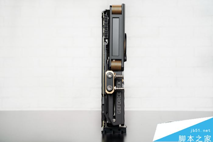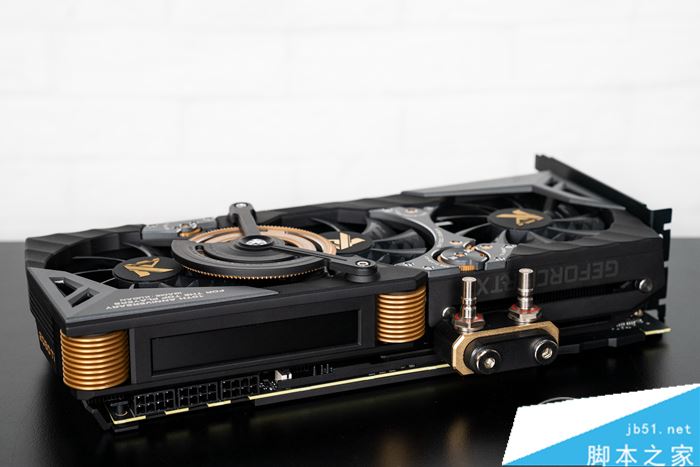 顯卡頂部顯示器兩側各有一個金屬線圈的裝飾件,更添一份朋克風。
