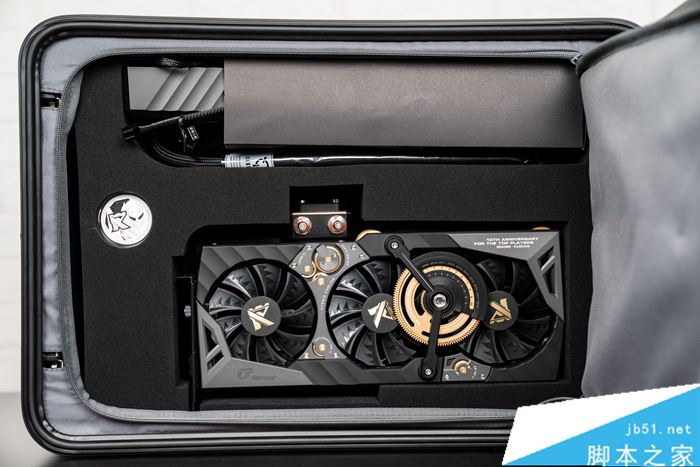 打開以后,你就能看到iGame RTX 2080 Ti Kudan靜靜地躺在里面,只要你取掉保護的海綿,行李箱就能單獨使用啦。