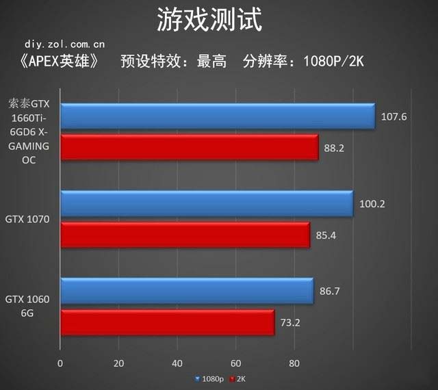 最后在最近火熱的《APEX英雄》中,索泰GTX 1660Ti-6GD6 X-GAMING OC的幀數仍處于領先,兩者幀數均超過了100幀。