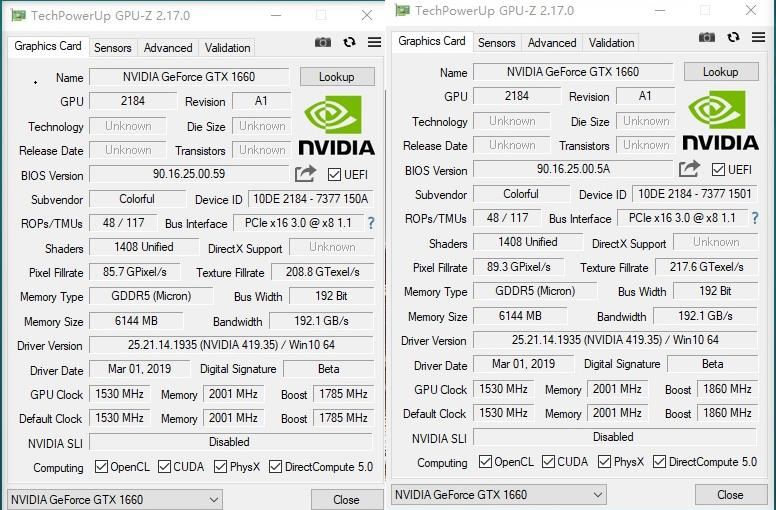 iGame GeForce GTX 1660 Ultra 6G的GPU-Z參數截圖。左邊是標準的BIOS,參數與公版完全相同,TDP只有并鎖死了120W。