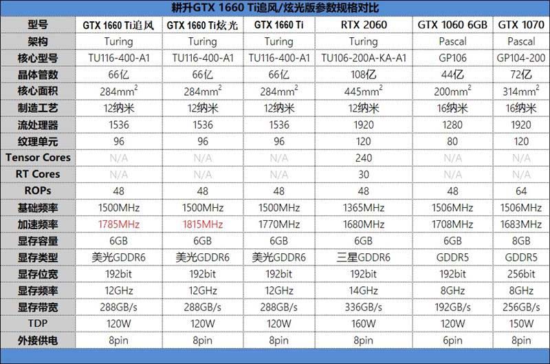 耕升GTX 1660 Ti追風/炫光的參數如下: