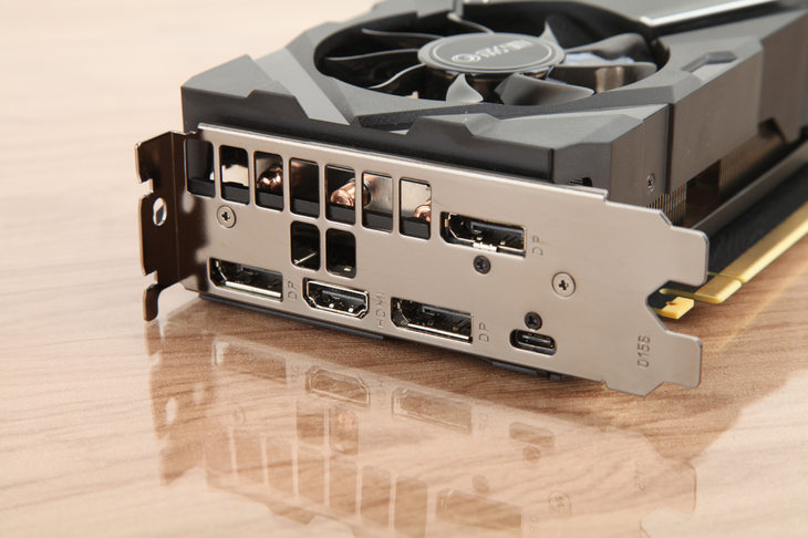 接口部分與公版產品保持一致,共三枚DP1.4接口,一枚HDMI2.0b接口,一枚用于VR頭顯的Type-C接口。