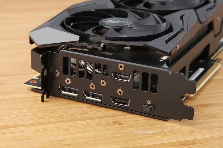 接口部分保持了華碩一貫的雙HDMI2.0設計,同時也 保留了兩枚DP接口,另外RTX20系列顯卡還新增了支持35W供電的Type-C接口用于VR頭顯的接駁。