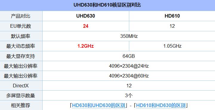 HD 610屬于最入門級GT1,UHD 630則屬于GT2級別。HD 610的12個EU單元相比UHD 630少了一半,核顯要低2個級別,核顯性能很低,不適游戲玩家(搭配獨顯除外),僅適合高清影音、一般的日常辦公需求。
