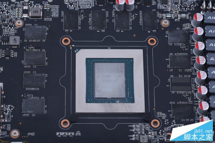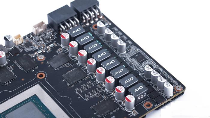 而具體在PCB設計上,我們一方面可以看到包括AIO電感在內的索泰常見元器件,另一方面可以看到為成功將旗艦級別的GTX 1080 Ti縮小至千元級別的GTX 1050 Ti水平,電子元器件幾乎鋪設至PCB邊緣部分,除顯存芯片的邊緣尚有空間之外,幾乎連站票都賣不出去,如果不使用堆棧式的HBM顯存,這種鋪設密度應該無法做到更高了(除非鋪設在背面)。