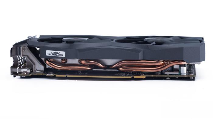 雖然坐擁強大的GP102核心,但是這塊GTX 1080 Ti Mini的身形依然是雙風扇、雙槽設計,三圍和GTX 1050 Ti完全站在一起,導流罩上幾乎所有的空間都被雙風扇占據,但是仔細觀察的話會發現其實兩幅風扇其實是一大一小設計,靠近視頻接口擋板一側的風扇直徑為9cm,而身處PCB邊緣的風扇直徑為10cm(注意,散熱器其實已經超過PCB),這種設計能為小型化的GTX 1080 Ti帶來多好的散熱效果呢?這也是我們后面測試的關鍵。