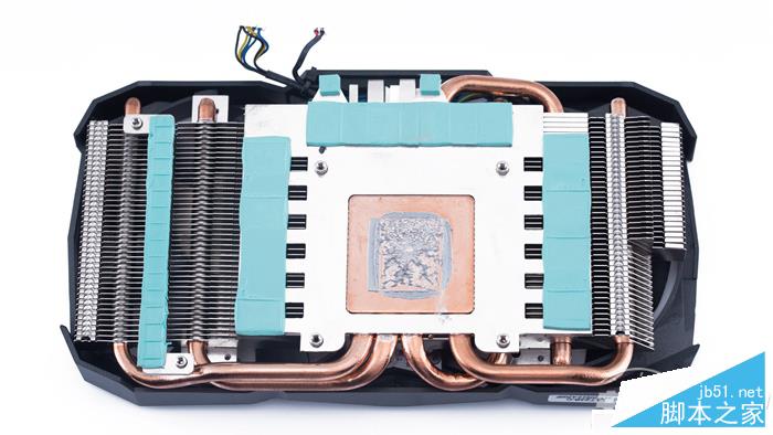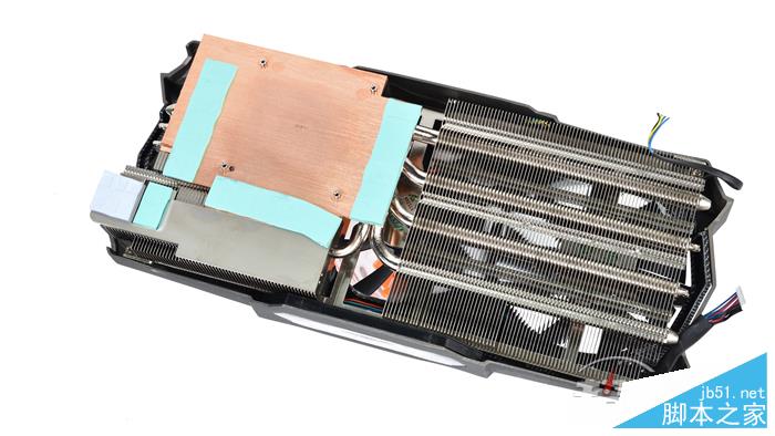 首先來看看散熱方案,GTX 1080 Ti Mini使用和GTX 1080 Ti PGF數量一致的五熱管,厚度為6mm。但是在具體方案上可以看到為盡可能充分地利用空間,并沒有讓GPU底座與散熱鰭片陣列分離,而且可以看到在導流罩的下方散熱鰭片幾乎占據所有空間。此外在結構上,一般常見的方案是風扇、熱管/散熱鰭片、強風散熱板,但是對于GTX 1080 Ti Mini來說,鰭片和散熱板是不可分離的。另外在散熱板上針對顯存、Mosfet的位置鋪設幫助散熱的導熱脂,手感軟軟黏黏的,這也是索泰高端顯卡常用的方案。