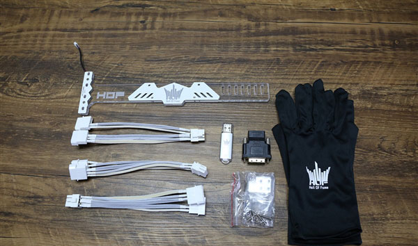 影馳GTX 1080Ti 名人堂限量版采用了全新的雙開門包裝設(shè)計(jì),并增加了多樣配件,包含RGB顯卡支撐架、DVI轉(zhuǎn)HDMI接頭、純白供電轉(zhuǎn)接線、8GB3.0高速U盤、防靜電手套。