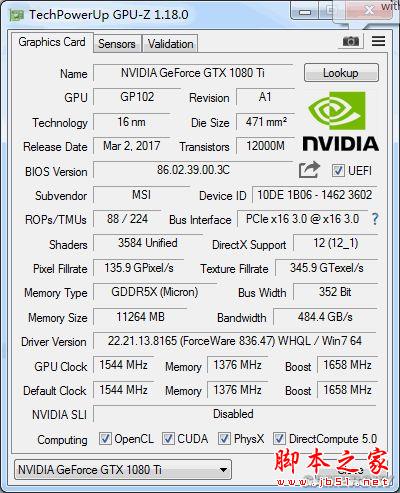 言歸正傳,我們先看微星GTX 1080Ti GAMING X的規(guī)格參數(shù),貼上GPU-Z截圖。