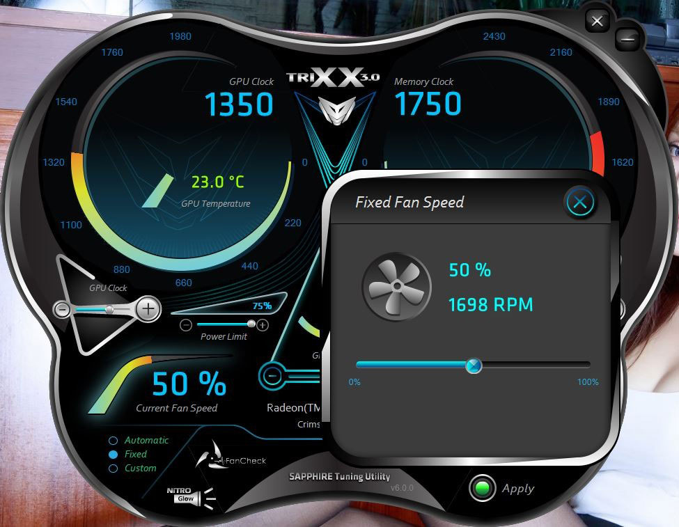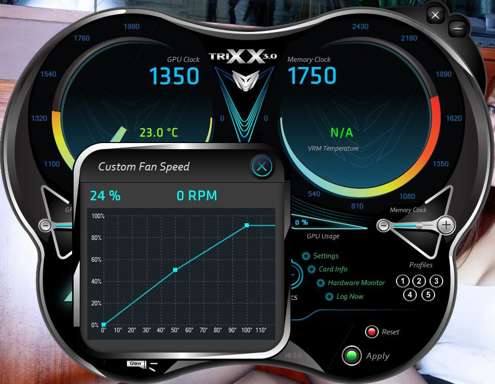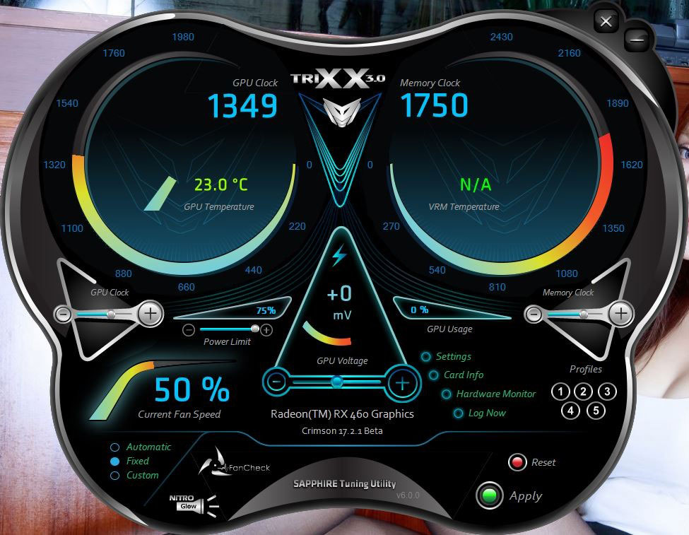 超頻用藍(lán)寶石的TRI XX最新版,比進(jìn)BIOS超頻方便一點(diǎn),之前在朋友家的平臺上用映泰主板超到了1400M,結(jié)果回來換了我的平臺就死活超不上去了,不知道是不是因?yàn)殡娫刺?,算了,勉?qiáng)超到1350M玩玩吧,找個(gè)時(shí)間把問題排除一下再重新買。