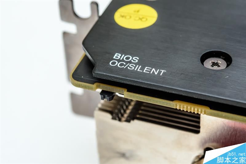 背板上的絲印有標示顯卡開關的用途,靠近PCI擋板處的是雙BIOS的切換開關,SILENT檔和OC檔的核心頻率分別為1411和1439。我測試時采用的是SILENT檔。