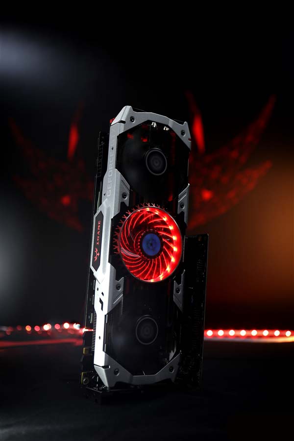 該卡擁有全新的Silver Shark銀鯊散熱器,鰭片加高5厘米,總散熱面積增加30%,搭載兩個9cm、一個8cm iRing風扇,后者可進行不同的導流作用,還有四條8毫米、一條6毫米純銅熱管。