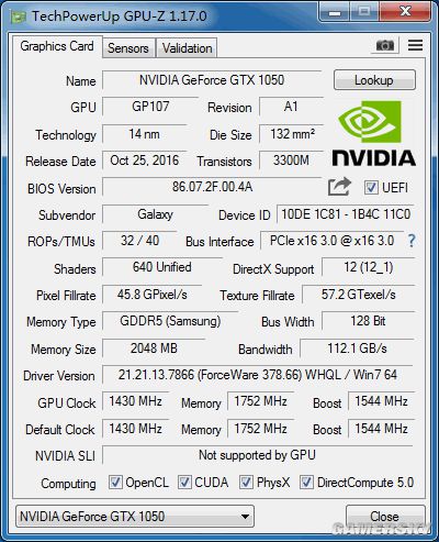 影馳GTX 1050Ti GAMER的GPU-Z信息一覽