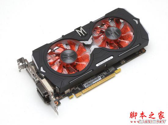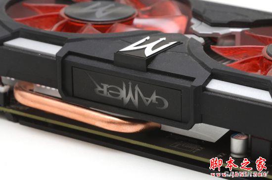 影馳GTX 1050Ti GAMER的設(shè)計風(fēng)格沿襲GAMER系列的一貫路線,黑色的風(fēng)扇整流罩搭配棗紅色半透明扇葉,雙風(fēng)扇布局,正中央有變形成海皇三叉戟一樣的"M"字樣裝飾。