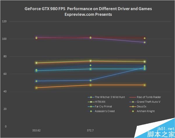 但是再來看GeForce GTX 980的表現(xiàn)則讓人難以輕易斷言,首先在GeForce 372.70版本驅(qū)動獲得的1.16%的性能提升非常小,幾乎可以忽略不計,但是去年12月年末的GeForce 376.33版本驅(qū)動便出現(xiàn)5.34%的性能下降。這個數(shù)字雖然沒有嚴重到可以判作“負優(yōu)化”證據(jù)的地步,但是已經(jīng)不宜作為誤差或者其他不可抗力因素影響,至少在數(shù)字上看便會讓強迫癥玩家感到周身瘙癢。