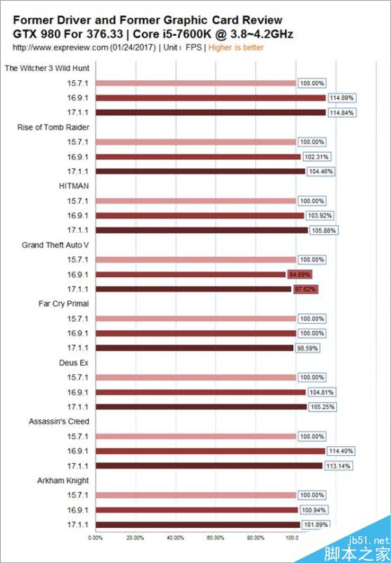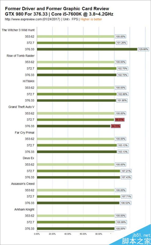 大家可以看到,縱坐標為游戲和驅(qū)動的信息,橫坐標為驅(qū)動演進之后性能變動的百分比情況,這里的百分比是每一次的性能表現(xiàn)和第一版驅(qū)動(GeForce 353.62)的對比。大家可以看到唯一出現(xiàn)性能下降的游戲是我們用紅色標注出來的《俠盜獵車手5(Grand Theft Auto V)》,GeForce 372.70版本的性能基本可以看作一致,但是在最近的GeForce 376.33版本驅(qū)動中出現(xiàn)5.3%的性能下滑,但是和小編在此前說的一樣,這種程度的下降雖然值得注意,但是并不需要引起過度反應,稱之為“負優(yōu)化”也可以說是小題大做。