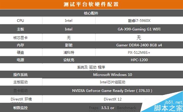 為保證測試能夠發揮顯卡的最佳性能,本次測試平臺采用最強酷睿芯——Intel酷睿i7-5960X處理器、技嘉X99芯片組主板、影馳 Gamer DDR4-2400 8GB 四通道內存、安鈦克1200w金牌電源組建而成。詳細硬件規格如下表所示: