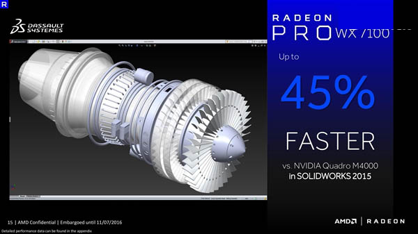 對手鎖定Quadro M4000,號稱比之快45%,而且支持專業級的VR方案。