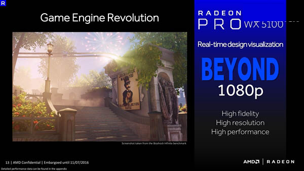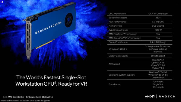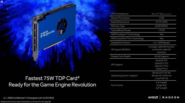 Radeon Pro WX 4100的核心換成了Polaris 11,但不像桌面版RX 460有所保留,它開啟了全部1024個流處理器,核心頻率約1.17GHz,單精度浮點性能2.4TFlops,功耗低于50W,半高式設計,號稱最快的半高式工作站顯卡。
