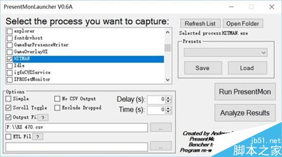 接下來我們需要正常的打開一個DX12游戲,這里我們選擇的是著名DX12游戲大作,殺手6,在正常進入游戲并進入游戲畫面之后,使用Alt-Tab命令切回我們的PML軟件,在右側的窗口中選中殺手6的進程“HITMAN”,如果沒有顯示游戲進程,可以點擊“Refreshlist”刷新一下。然后點擊其中的RunPresentMon,此時桌面會彈出一個命令符黑框,這時軟件就處于待命的狀態了。