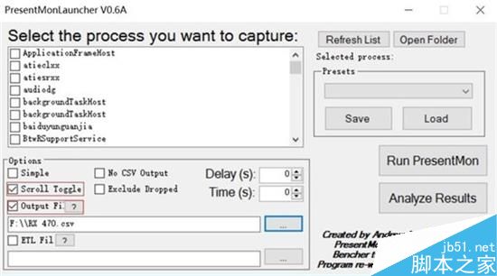 首先我們需要打開我們的PresentMonLauncher軟件(以下簡稱PML),然后勾選上scroll_toggle這個按鈕,也要勾選上這個OutputFile,并正確的選擇輸出文件的路徑,這里我們將測試文件命名為“RX470”并將輸出的文件路徑選擇在F盤根目錄下,這樣我們的PML軟件的設置工作就完成了。